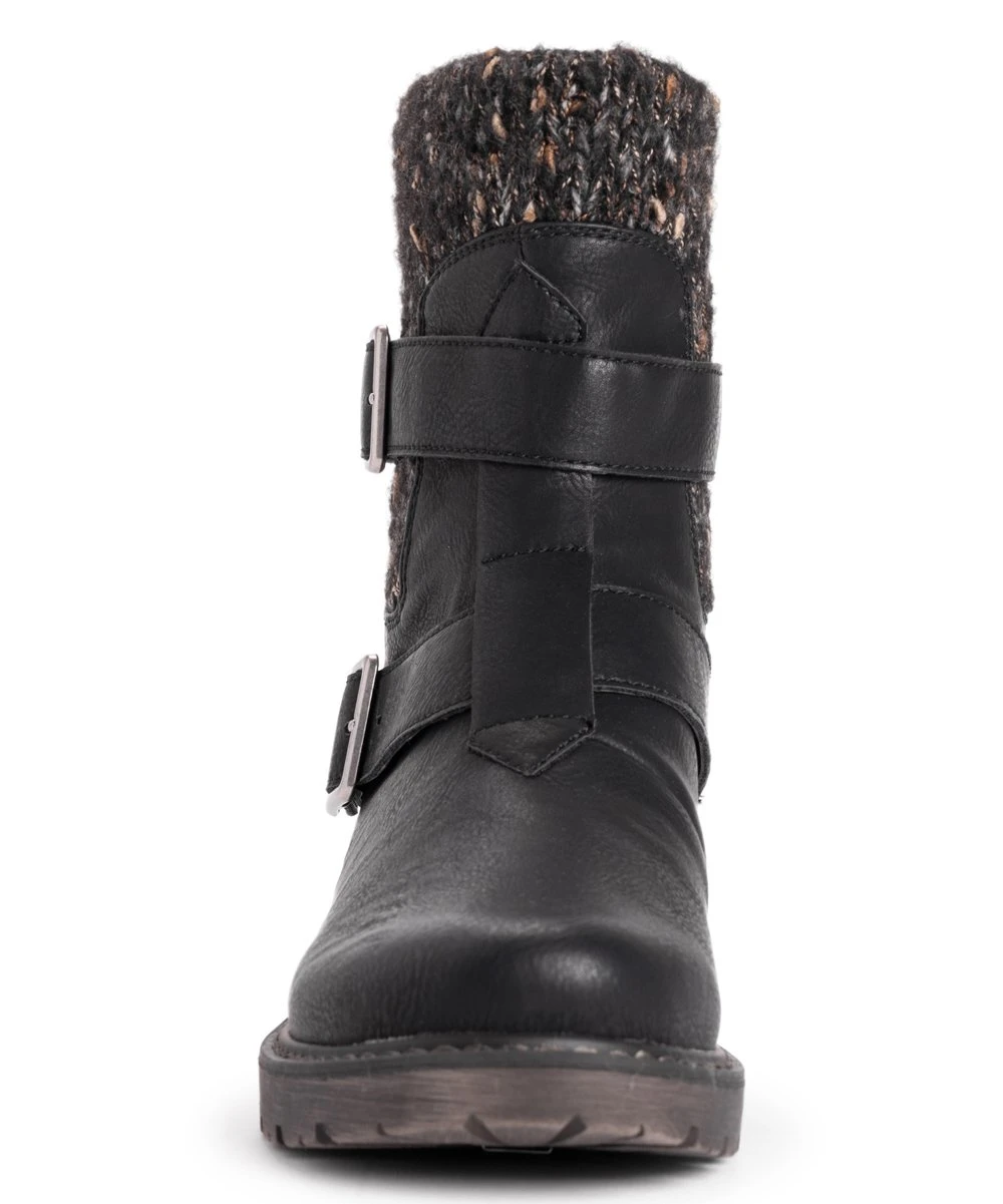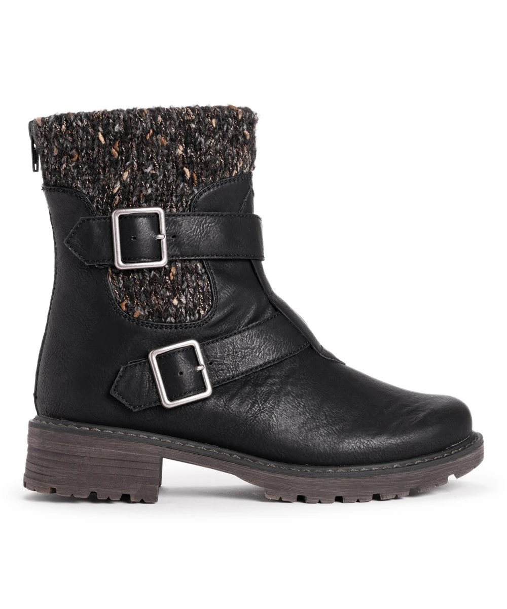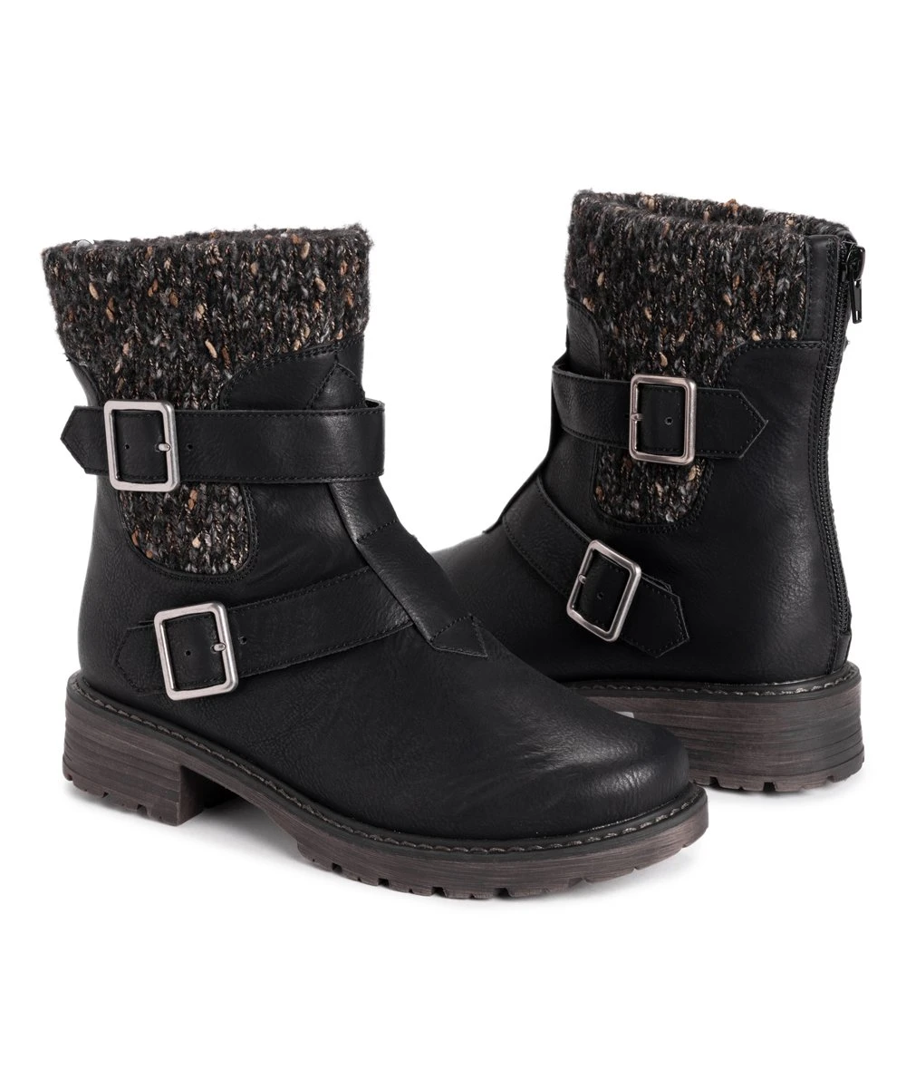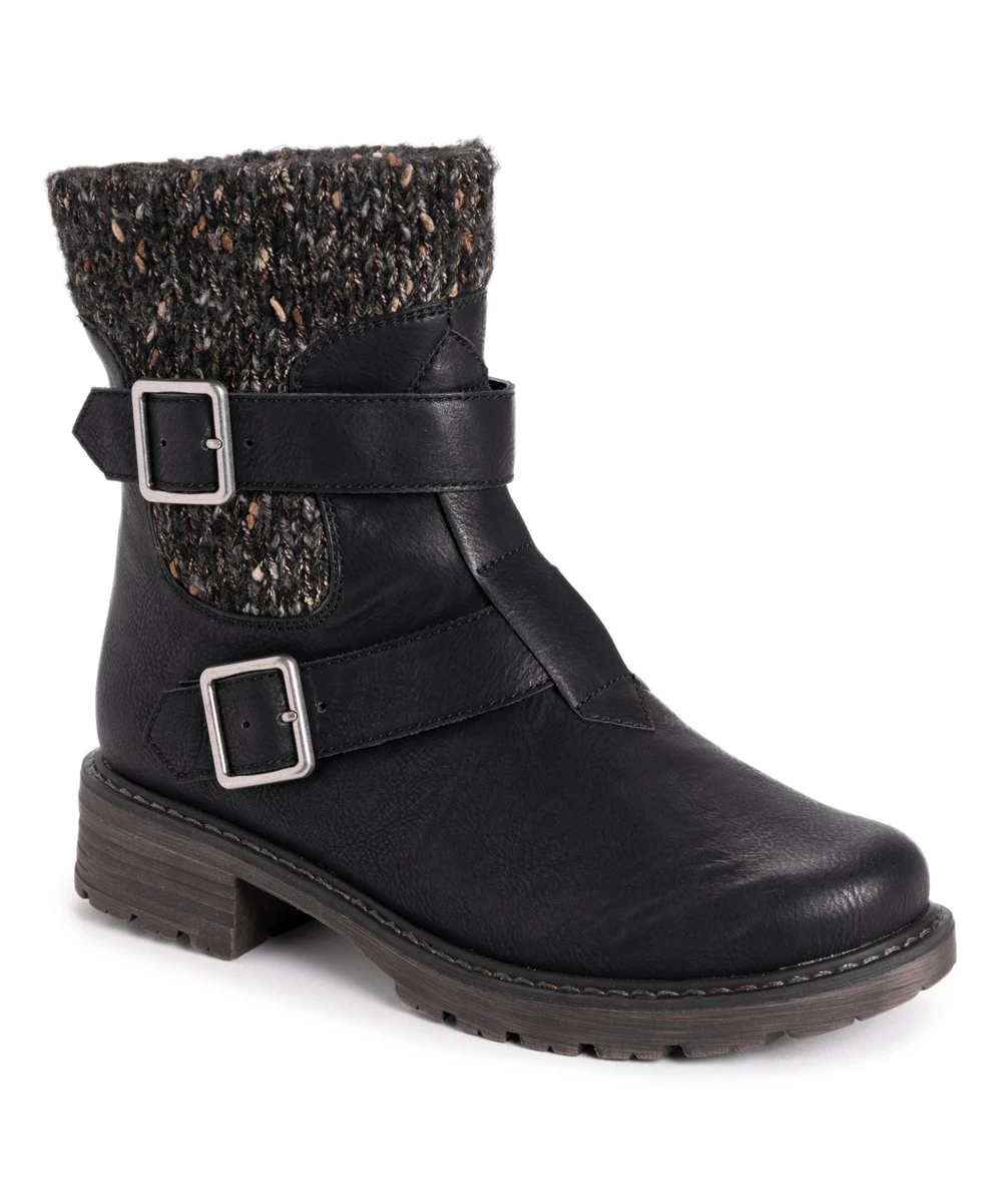 Spruce up your wardrobe this season with this modish ankle boot boasting a knit upper and buckle details for added flair.