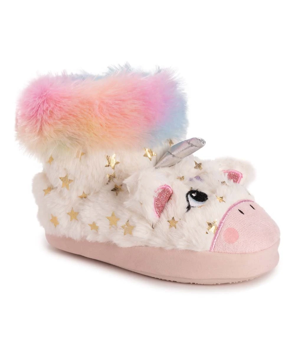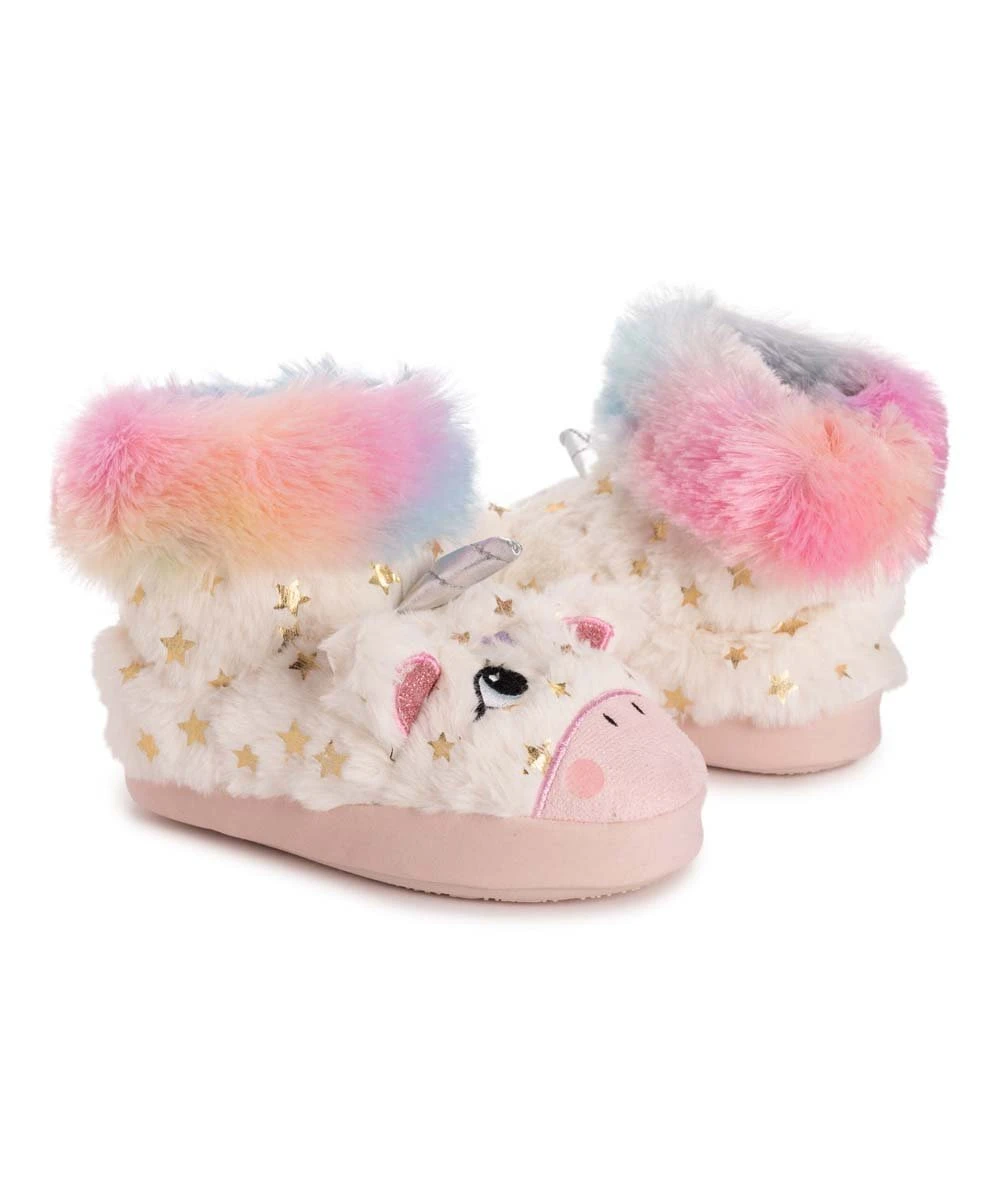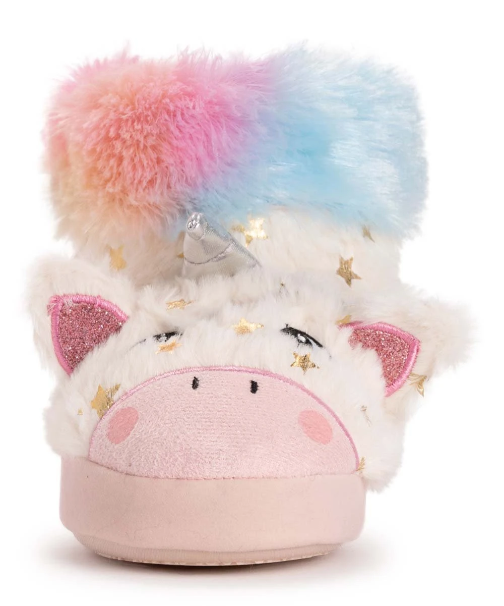 Cozy slipper boot with fuzzy faux fur details and a cute unicorn design.