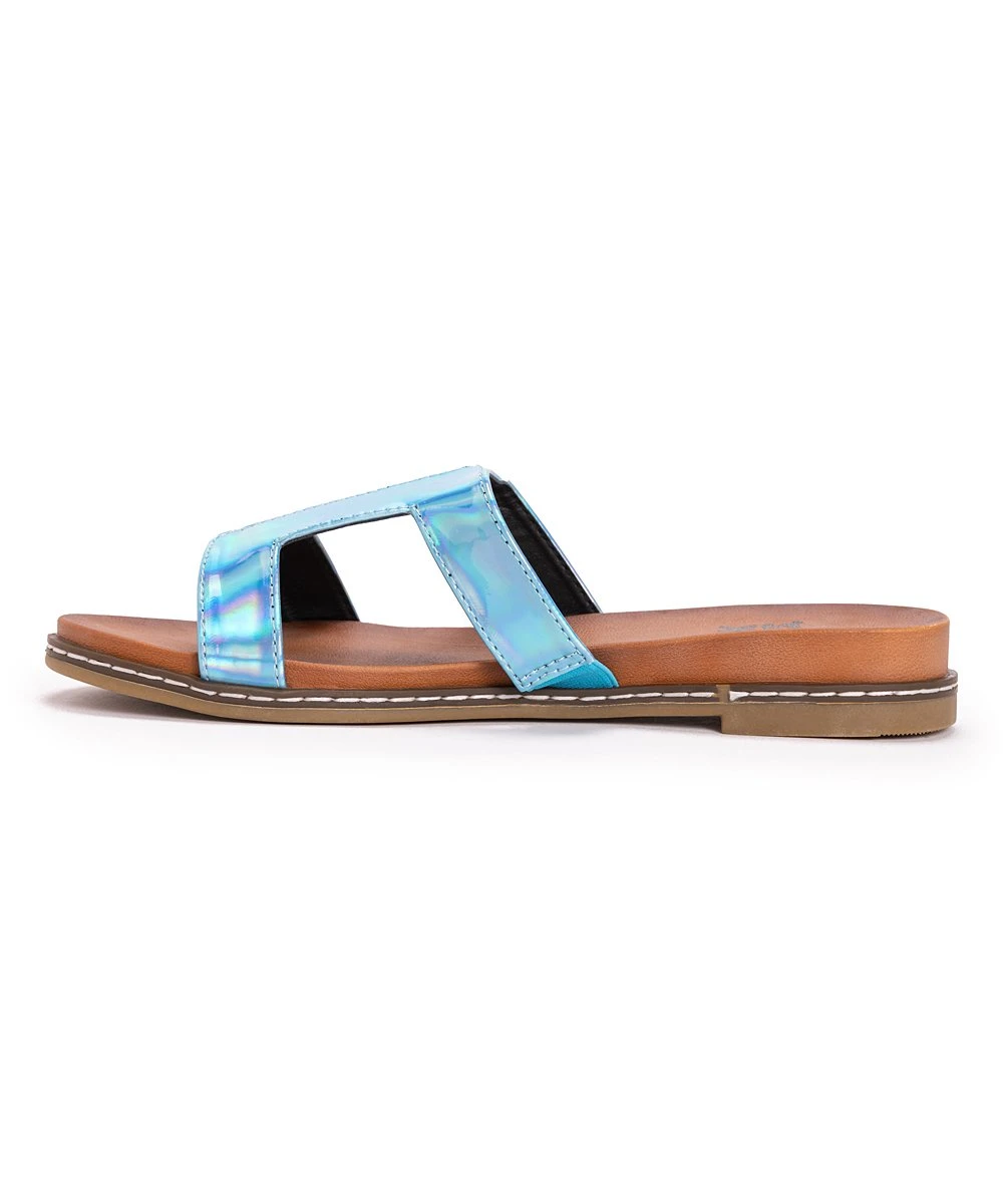 Frame your pedicure in these blue holographic slides made with a wide-set strap that secures steps that’s accented with side cutouts for an interesting look.