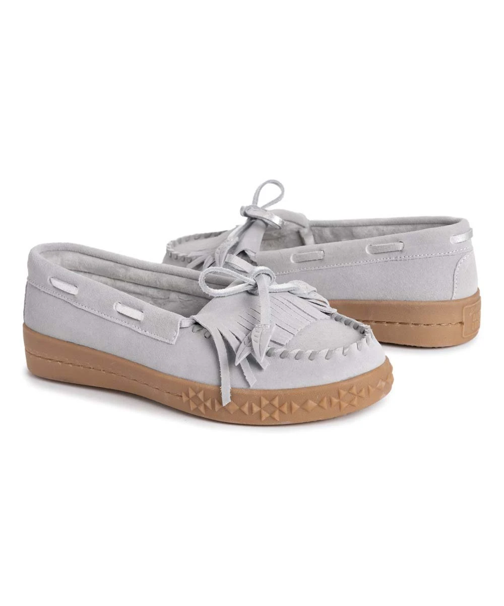 Cozy street moccasin featuring a suede upper and memory foam insole. Bow detail with cute leaf details.
